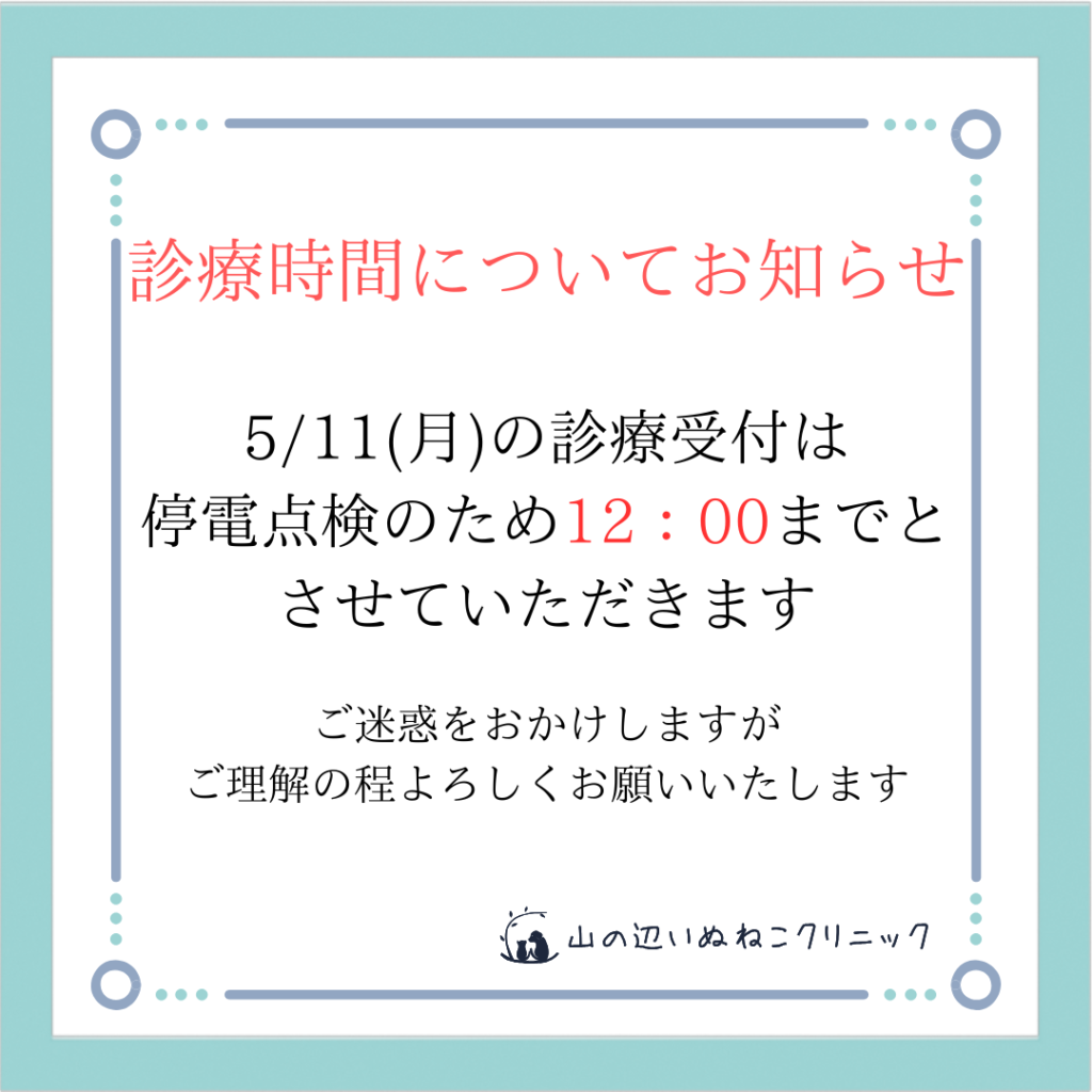 5/11(月)の診療受付は停電点検のため、12:00までとさせていただきます。